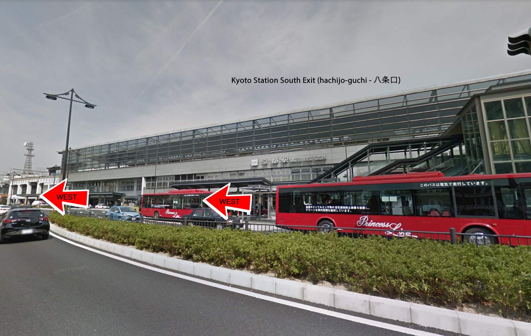 京都駅八条口(南側)前より八条通を西方向へ向かいます。:
