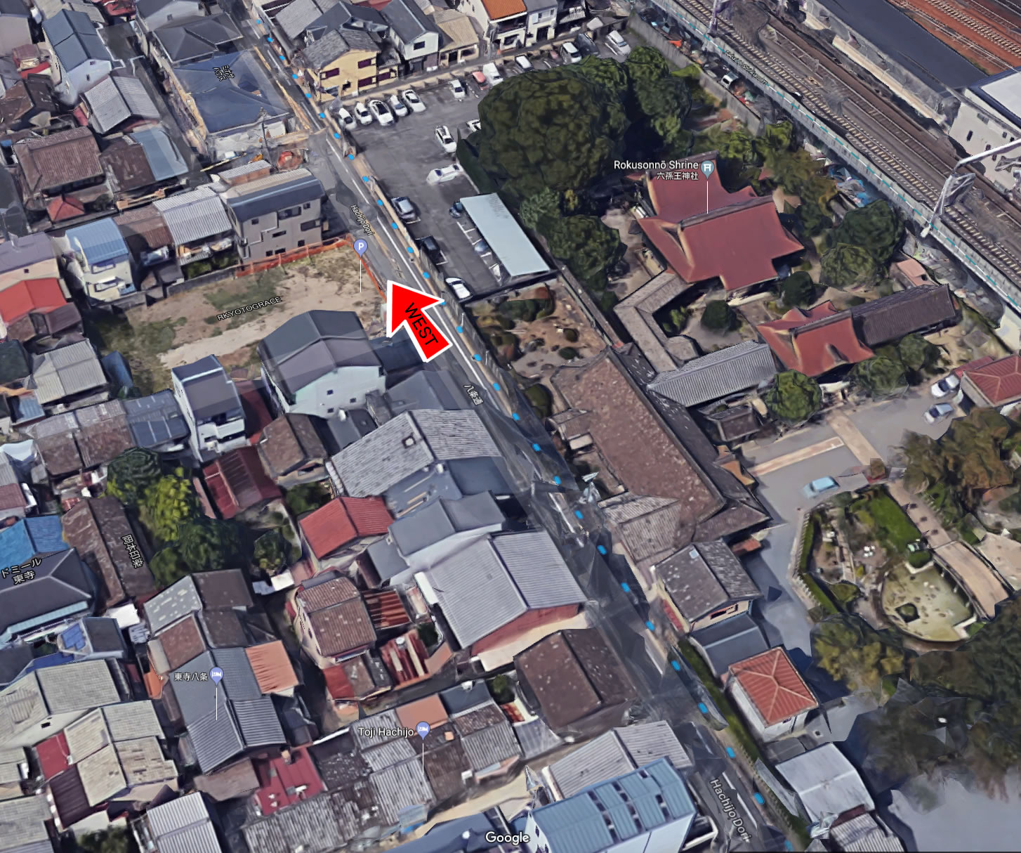 八条油小路交差点を西へ直進し、近鉄線の高架をくぐります。