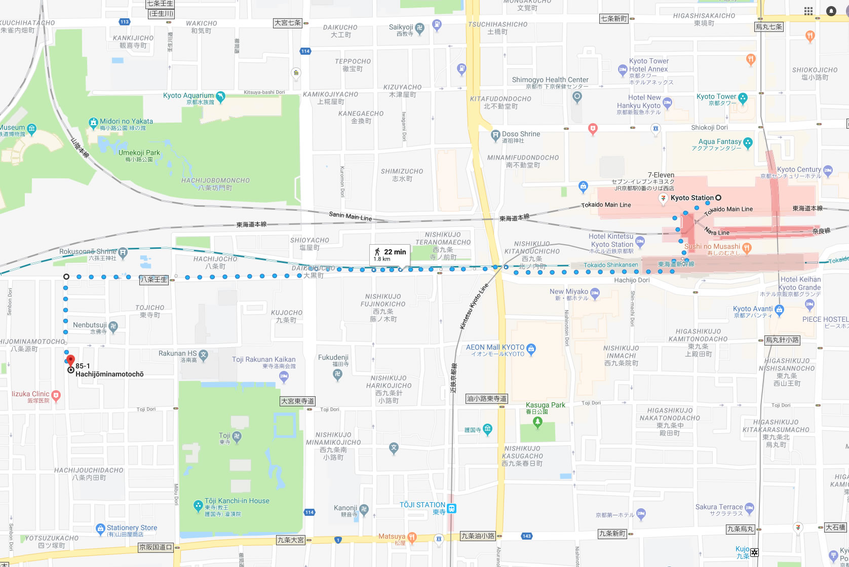 京都駅からUme Houseは直接ですと徒歩約20分です。