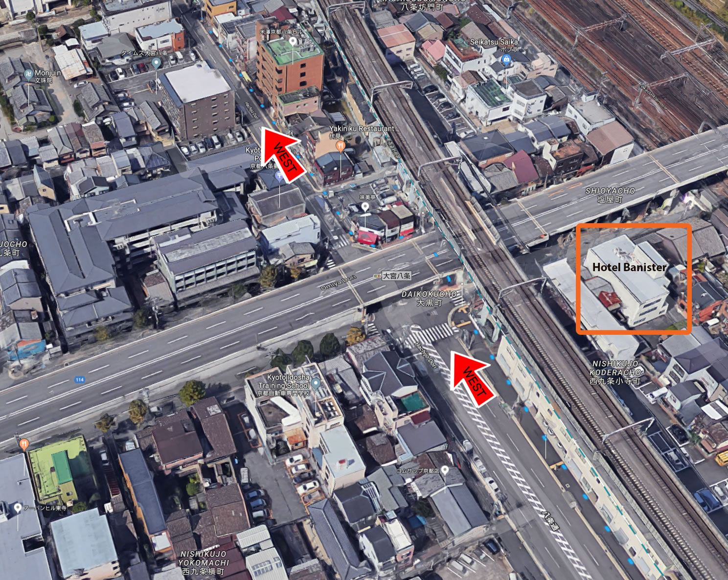 大宮通の高架をくぐり西へ直進します。(高架の手前を右折するとHOTEL BANISTER KYOTOがあります。)