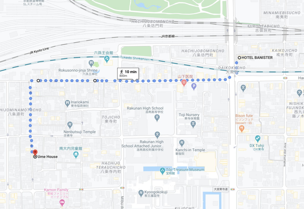 HOTEL BANISTER KYOTOからUme Houseは徒歩約10分、タクシーで約5分ほどです。